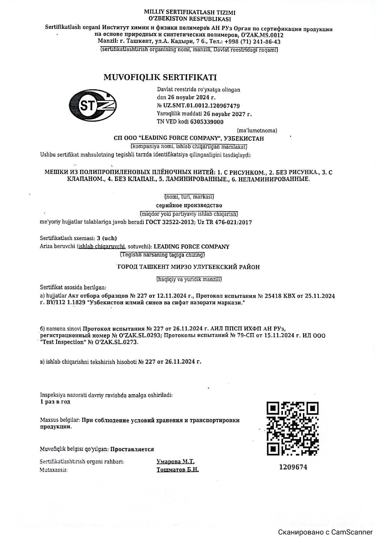 - Первый производственный участок по выпуску упаковочной продукции (полипропиленовые мешки) расположен по адресу: Чиланзарский р-н, ул.Сугали-ота общей площадью 7296,0 кв.м. (помещение АБК, производственный цех, караульная, ограждение, ворота, внутридворное бетонное покрытие), принадлежащее СП «Leading force company» на основании кадастровых документов №3-182/2003.